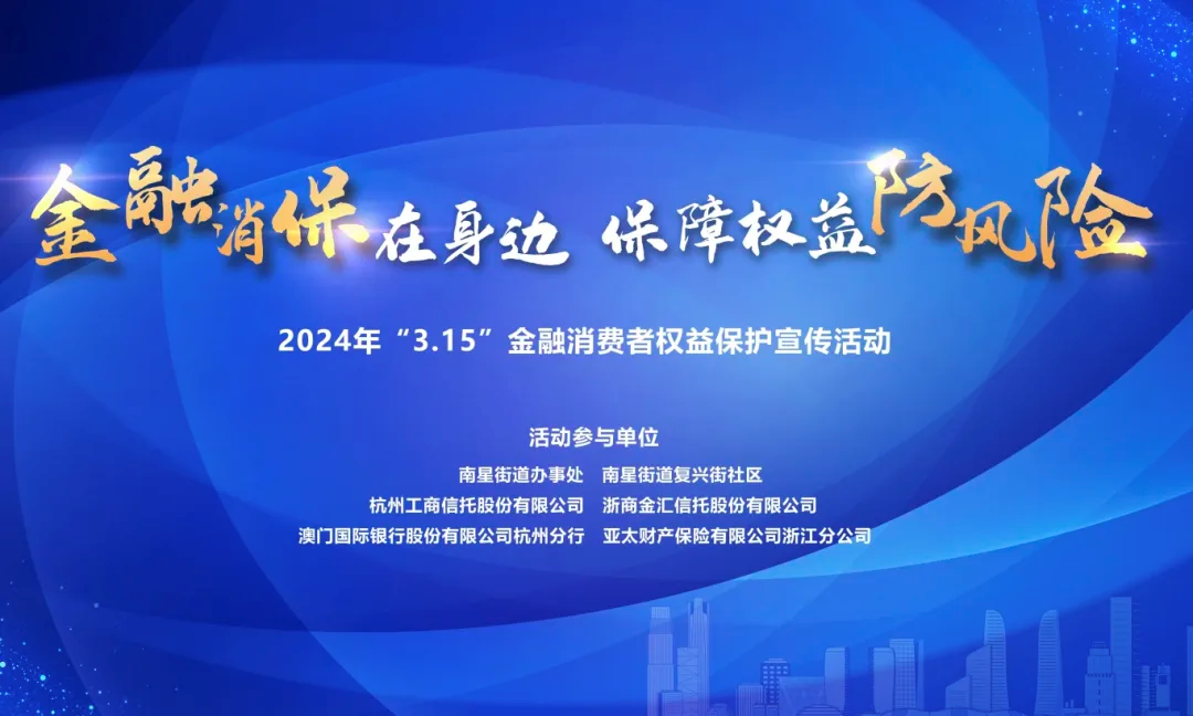 為進一步共築誠信消費環境,提振金融消費信心,打造弘揚新時代“楓橋經驗”浙江品牌,切實保障消費者合法權益,增強社區居民金融風險防範意識與能力,結合2024年全國銀行業保險業“3·15”消費者權益保護教育宣傳周活動方案及浙江省關於踐行新時代“楓橋經驗”深化年活動方案的相關要求,澳門國際銀行杭州分行聯合杭州工商信託股份有限公司、浙商金匯信託股份有限公司、亞太財產保險有限公司浙江分公司、南星街道辦事處、南星街道復興街社區等相關單位,在南星有意思書房附近廣場組織開展2024年“3·15”金融消費者權益保護宣傳活動。