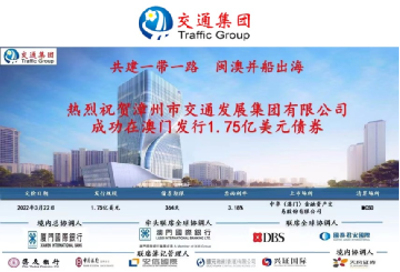 | 漳州市交通發展集團有限公司 全國首筆在澳門發行的漳州市企業債券,收益率創下同區域同類別同期限最低發行收益率。本次債券發行規模為1.75億美元,本行作為本次發債項目的牽頭全球協調人、聯席牽頭經辦人、聯席簿記管理人,本筆債券是澳門中央證券託管結算系統(“MCSD”)啟動以來全國地級市首單赴澳門市場發行的債券,亦是MCSD啟動以來全國非金融類企業發行的最大發行規模及最低票面利率的債券,本次債券的發行是漳州市屬企業在澳門資本市場的首秀,是全國首單地級市屬國企在澳門發債,具有重要的政治意義。本行服務發行人克服美元加息帶來的不利因素,大大降低了企業的融資成本,更為漳州市國企拓寬融資管道蹚出一條“新路”,亮出一張新的名片,起到良好的示範作用。 |
