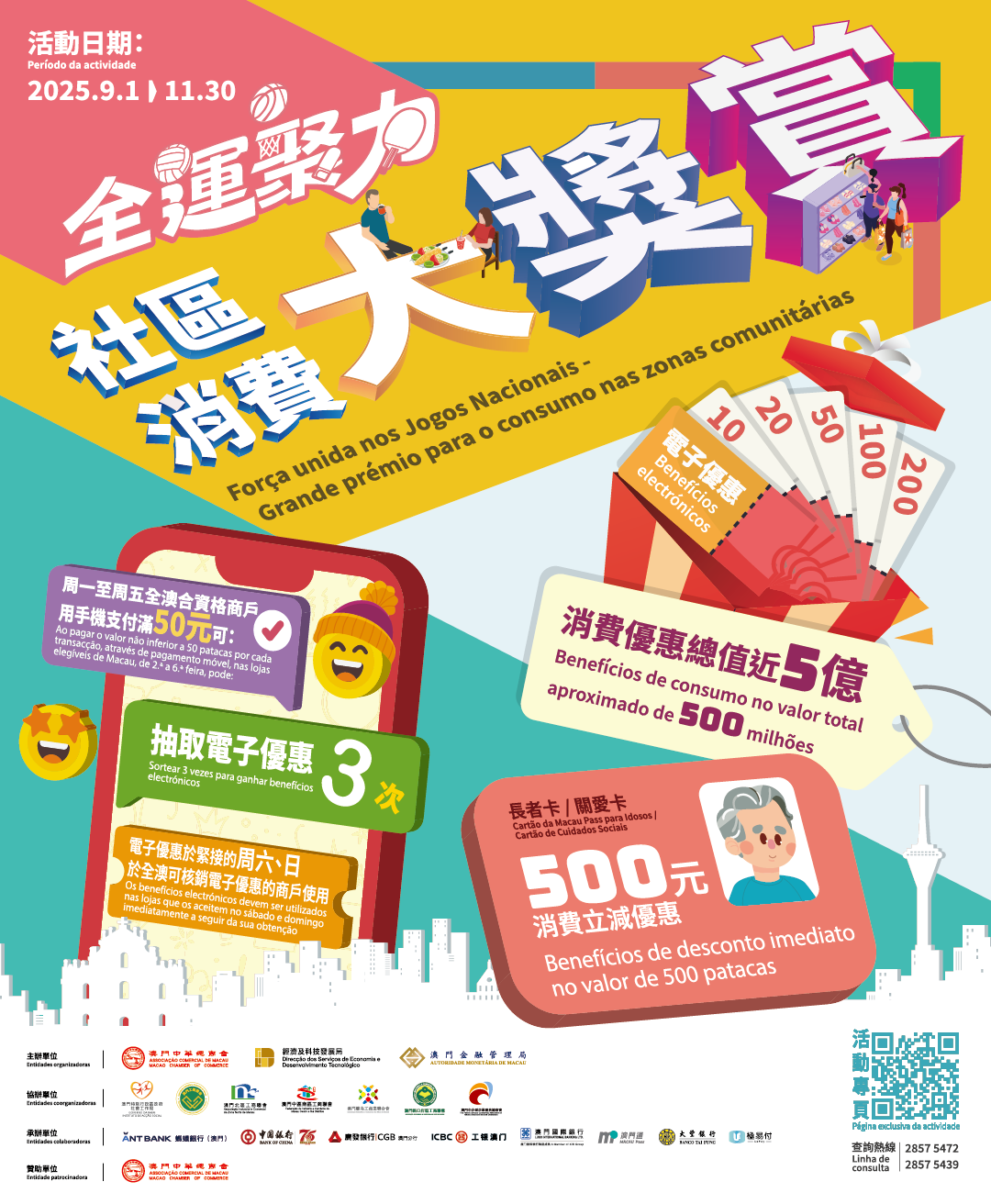 ** 註:指定商戶所指範圍為於線下在澳門設置實體門店之合資格商戶,但以下貨品服務及場景均不適用於本次活動範圍:自來水、電力、天然氣、燃料、電訊及視聽廣播服務、跨境交通服務、境外旅遊服務、醫療服務、公共部門及公共機構提供的服務、博彩活動場所、銀行、保險公司及其他金融機構、當押舖、大型連鎖超市、物業管理公司、教育機構、停車場、的士、線上消費平台、以及位於大型綜合旅遊休閒企業設施內的商戶。最終解釋權及決定權歸活動主辦單位所有。