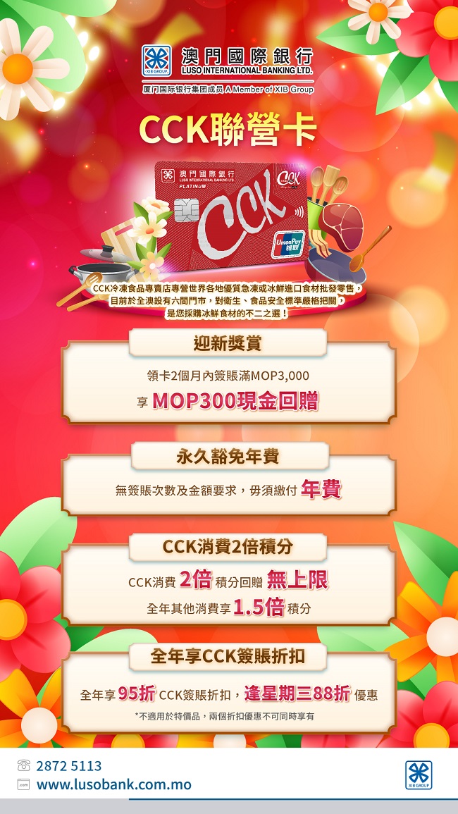 澳門國際銀行與CCK冷凍食品專賣店攜手誠意呈獻「CCK聯營卡」,助您輕鬆消費,創造更多新「煮」意!持有「CCK聯營卡」可享全年CCK冷凍食品專賣店簽賬折扣優惠外,還有機場貴賓室禮遇、迎新獎賞、積分回贈等多重禮遇!