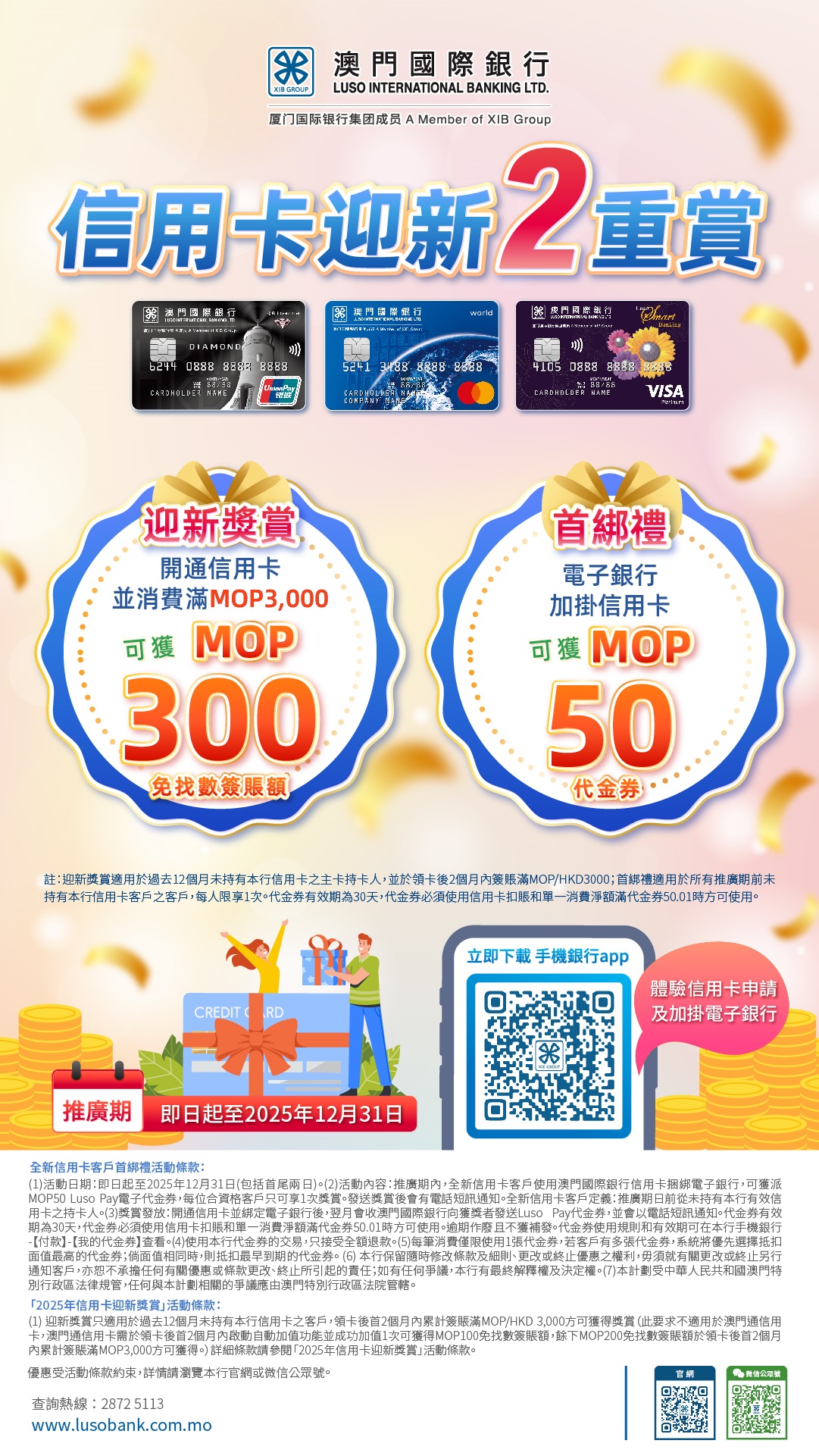 適用對象:推廣日前從未持有本行有效信用卡之客戶,並於推廣期內開通信用卡並綁定電子銀行方可符合資格。