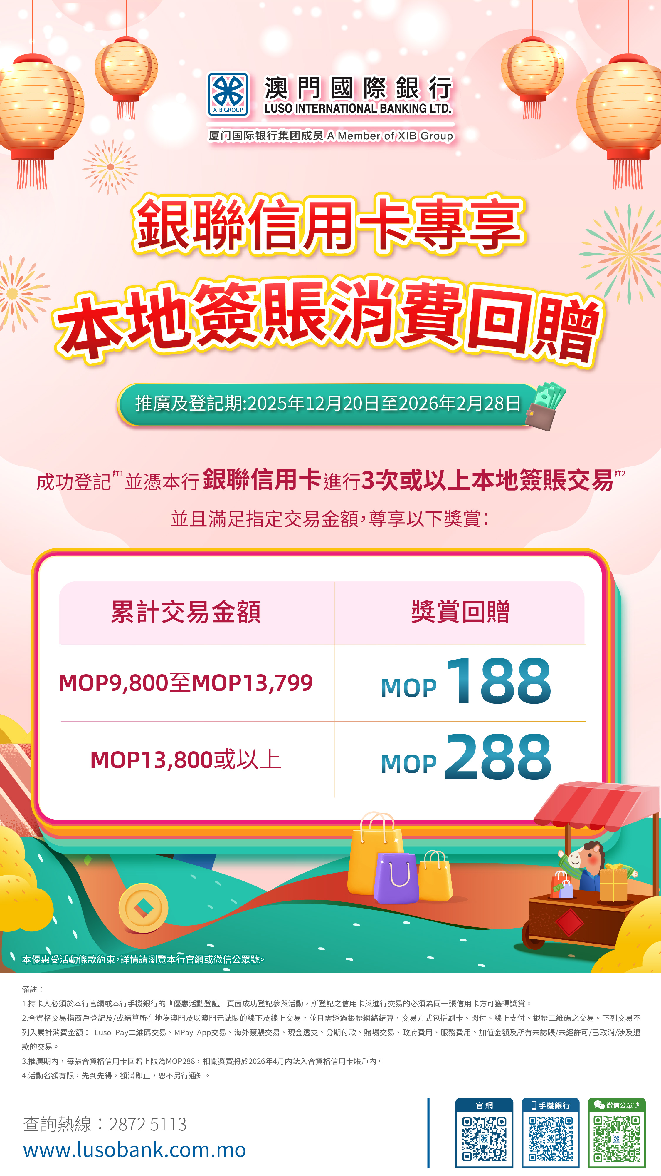 3. 推廣期內,每張合資格信用卡回贈上限為MOP288,相關獎賞將於2026年4月內誌入合資格信用卡賬戶內。