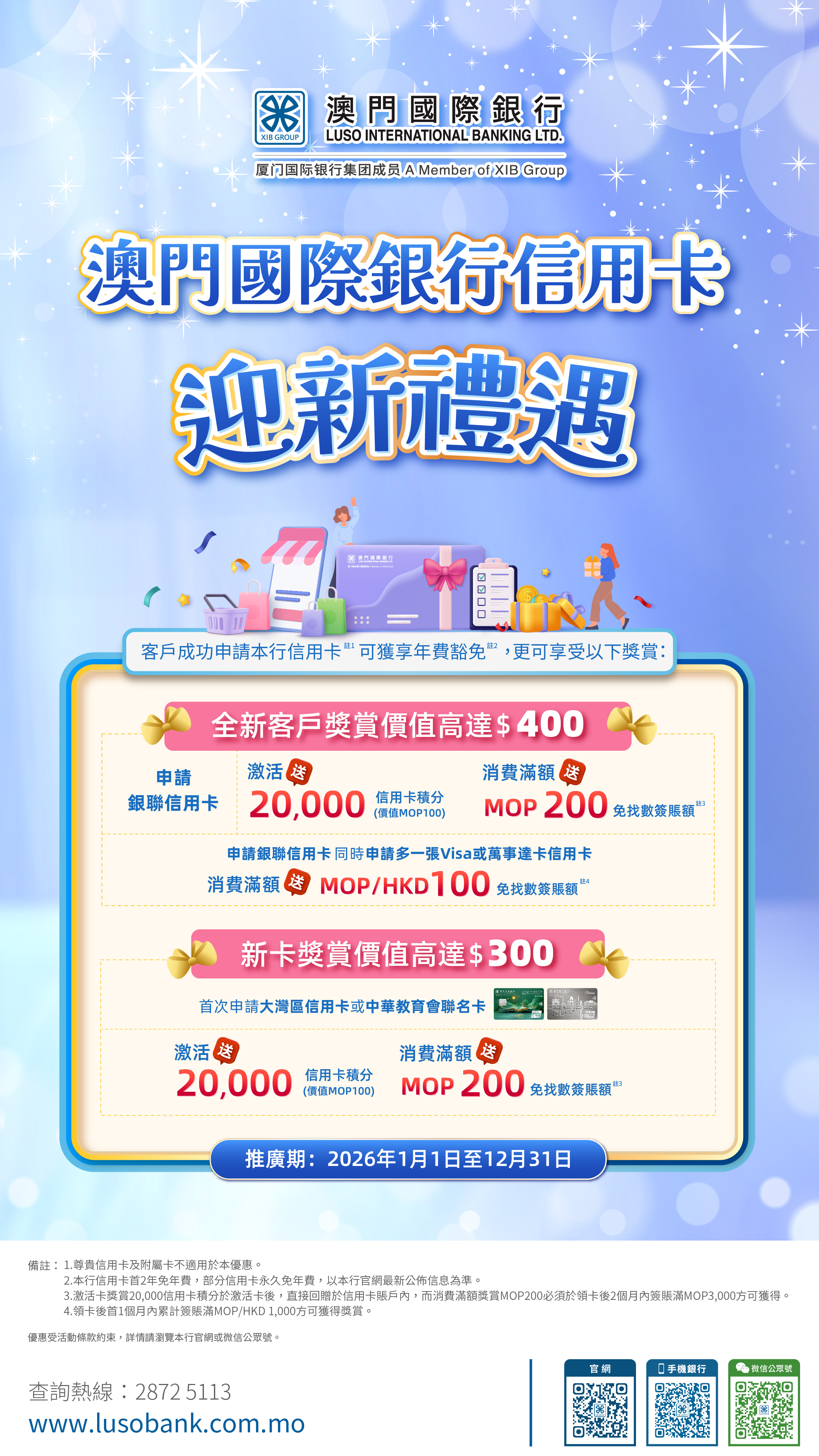 優惠受活動條款約束,詳情請瀏覽「2026年信用卡迎新獎賞」活動條款.pdf