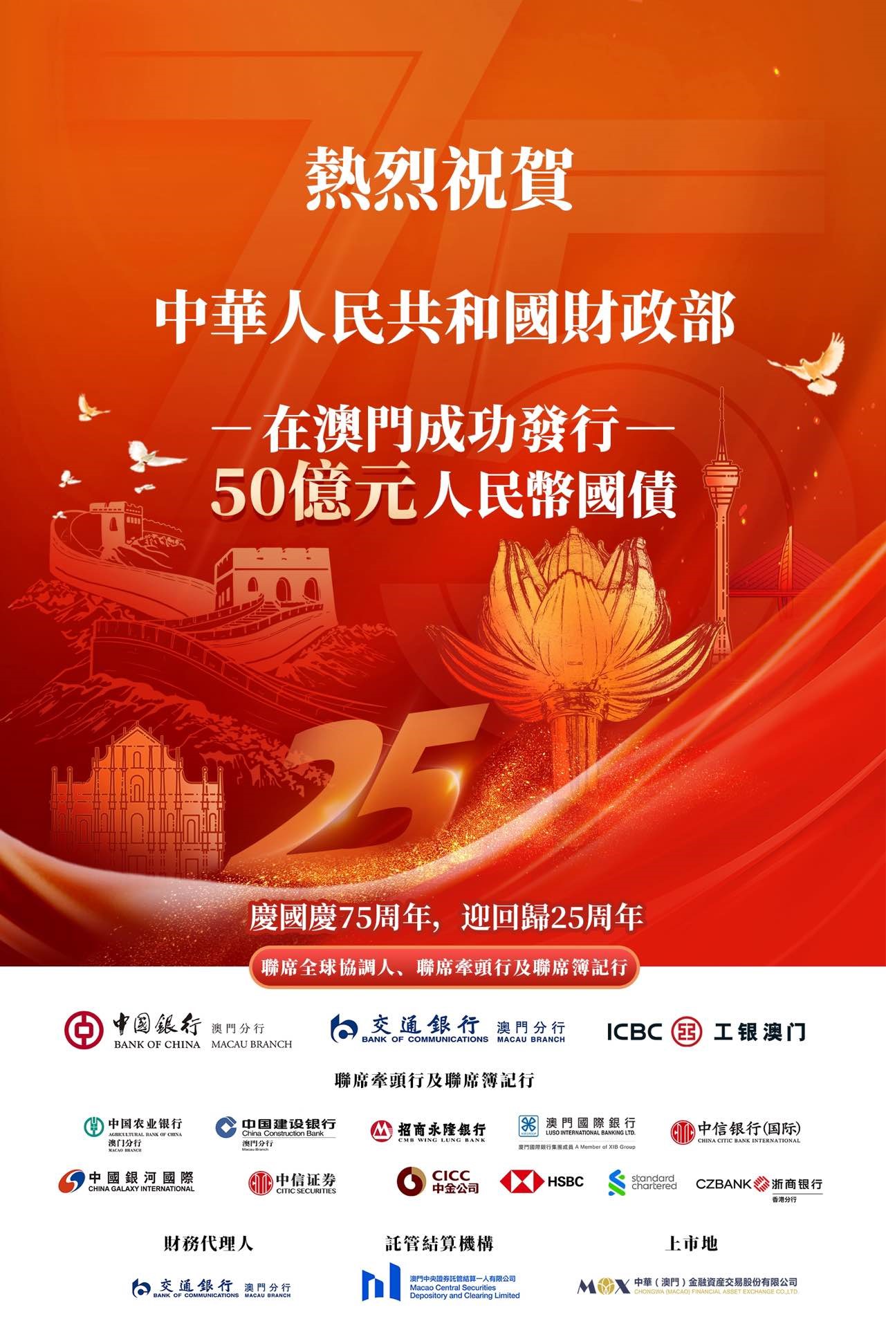 2024年10月30日,澳門國際銀行以聯席牽頭行及聯席簿記行身份第四次助力中華人民共和國財政部(以下簡稱“財政部”)國債在澳門成功發行。