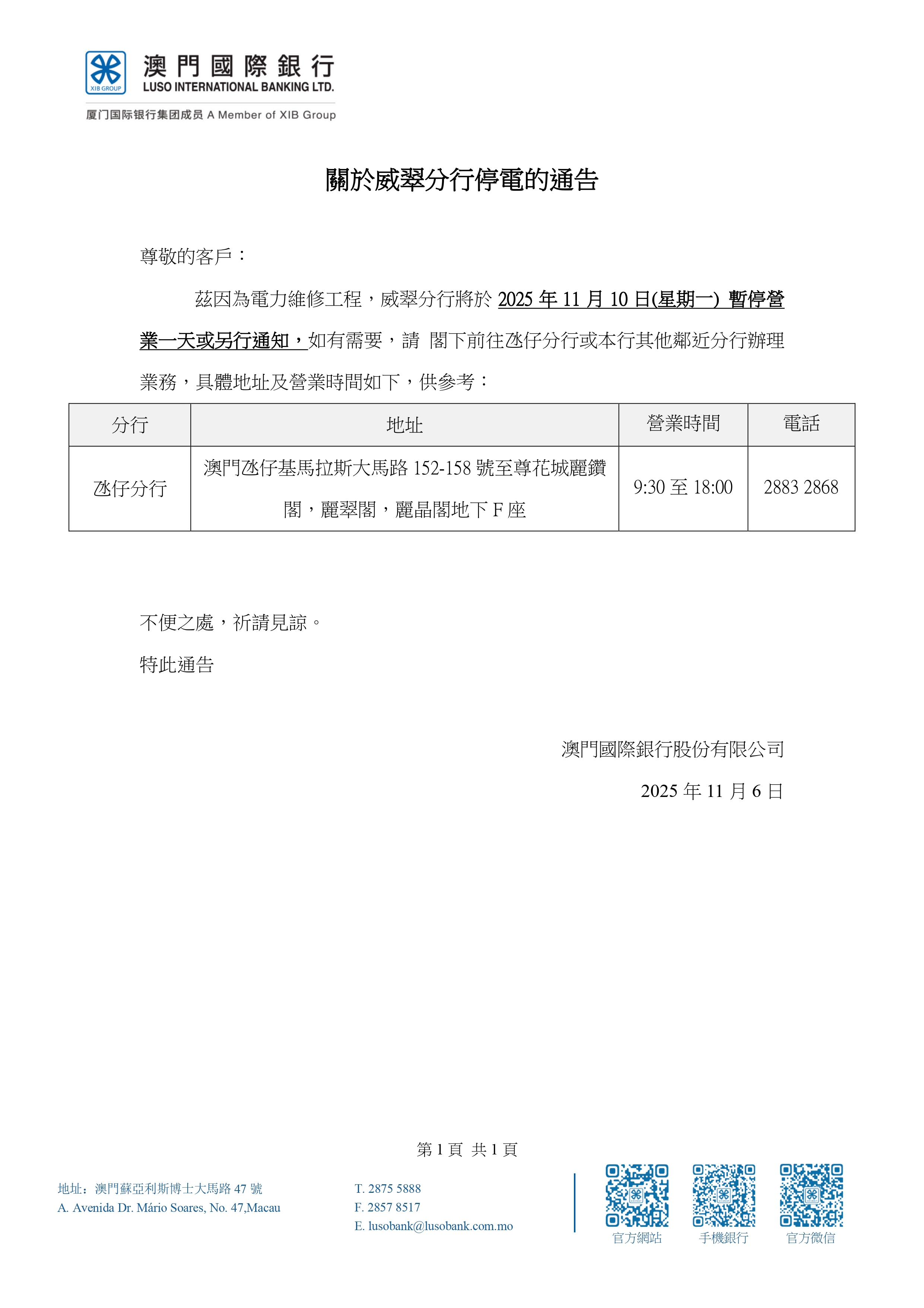 關於威翠分行2025年11月10日停電的通告