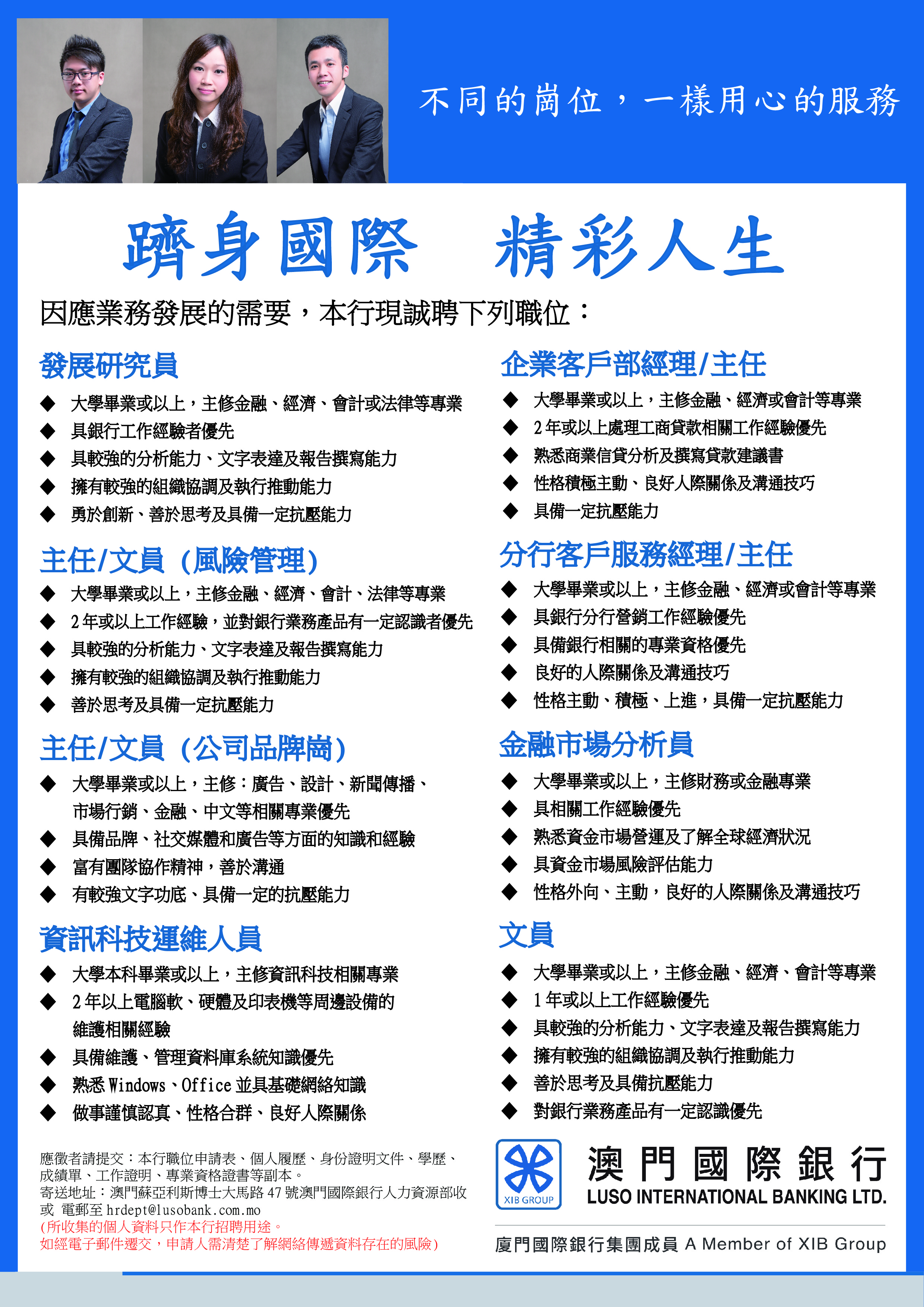 應徵者請填妥本行職位申請表,並提供履歷、身份證明文件、學歷、成績單、專業資格證書、工作證明等副本。寄送地址:澳門蘇亞利斯博士大馬路47號澳門國際銀行人力資源部收或電郵至hrdept@lusobank.com.mo。(如經電子郵件遞交,申請人需清楚了解網絡傳遞資料存在的風險)