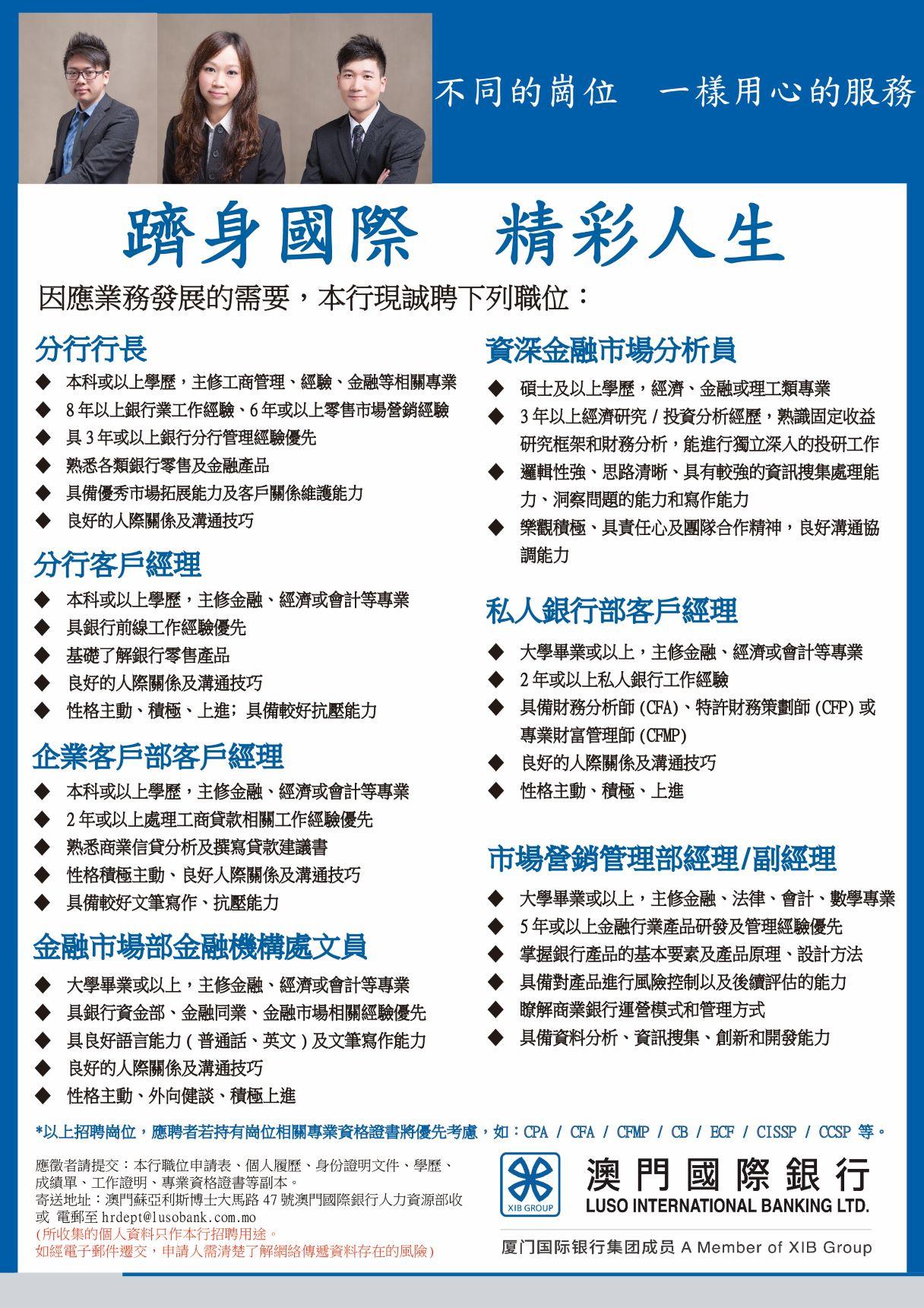 求職資料清單︰應徵者請填妥本行職位申請表,並提供個人履歷、身份證明文件、學歷、畢業成績單、專業資格證書、工作證明等副本。