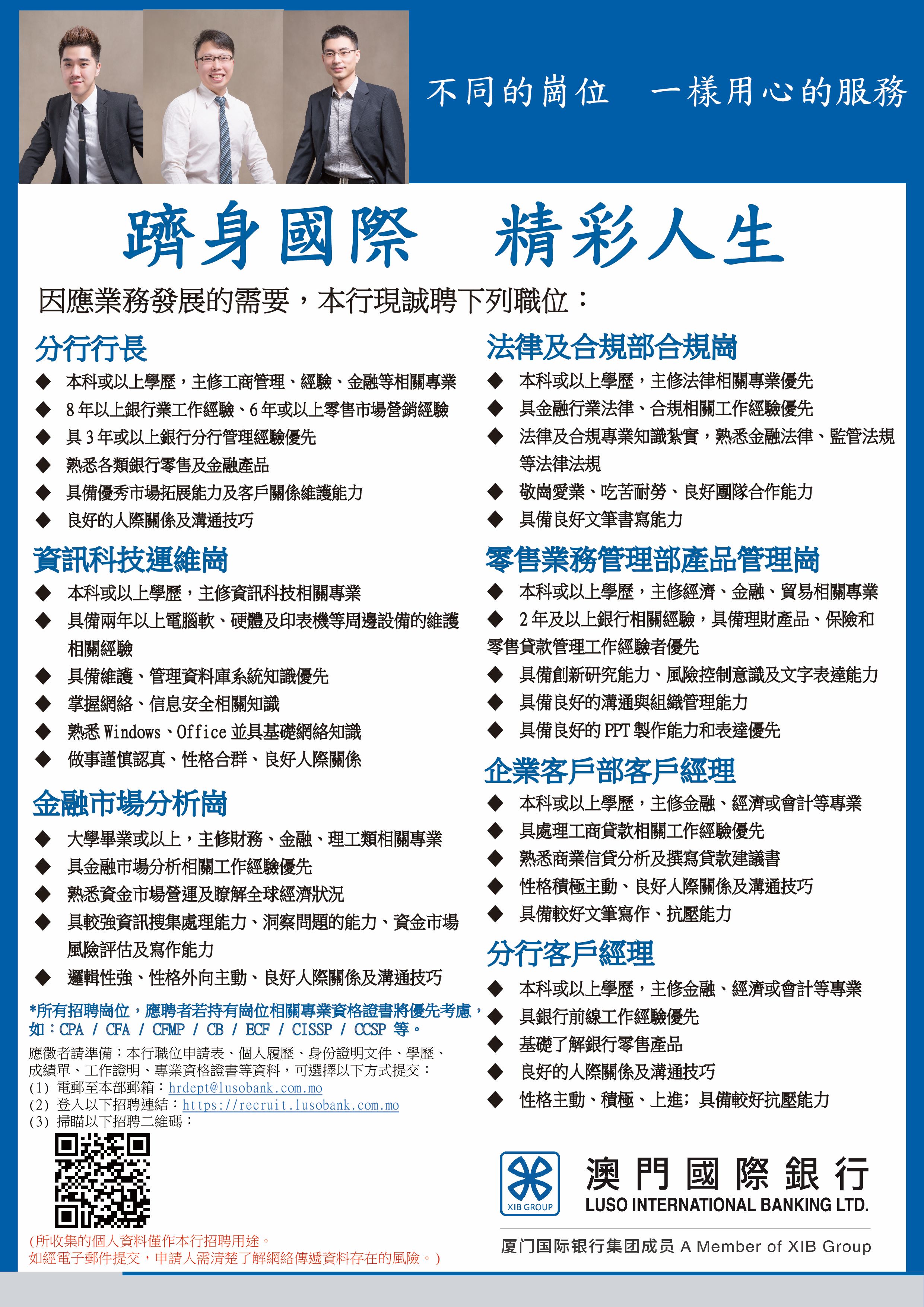 2. 電郵至hrdept@lusobank.com.mo (如經電子郵件遞交,申請人需清楚了解網絡傳遞資料存在的風險)