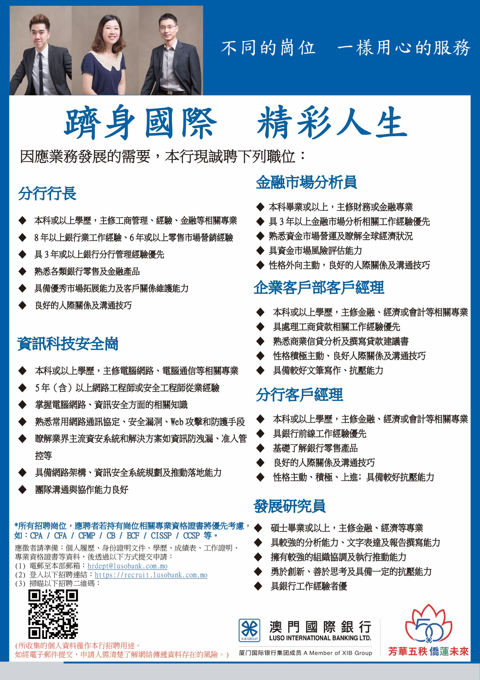 2. 電郵至hrdept@lusobank.com.mo (如經電子郵件遞交,申請人需清楚了解網絡傳遞資料存在的風險)