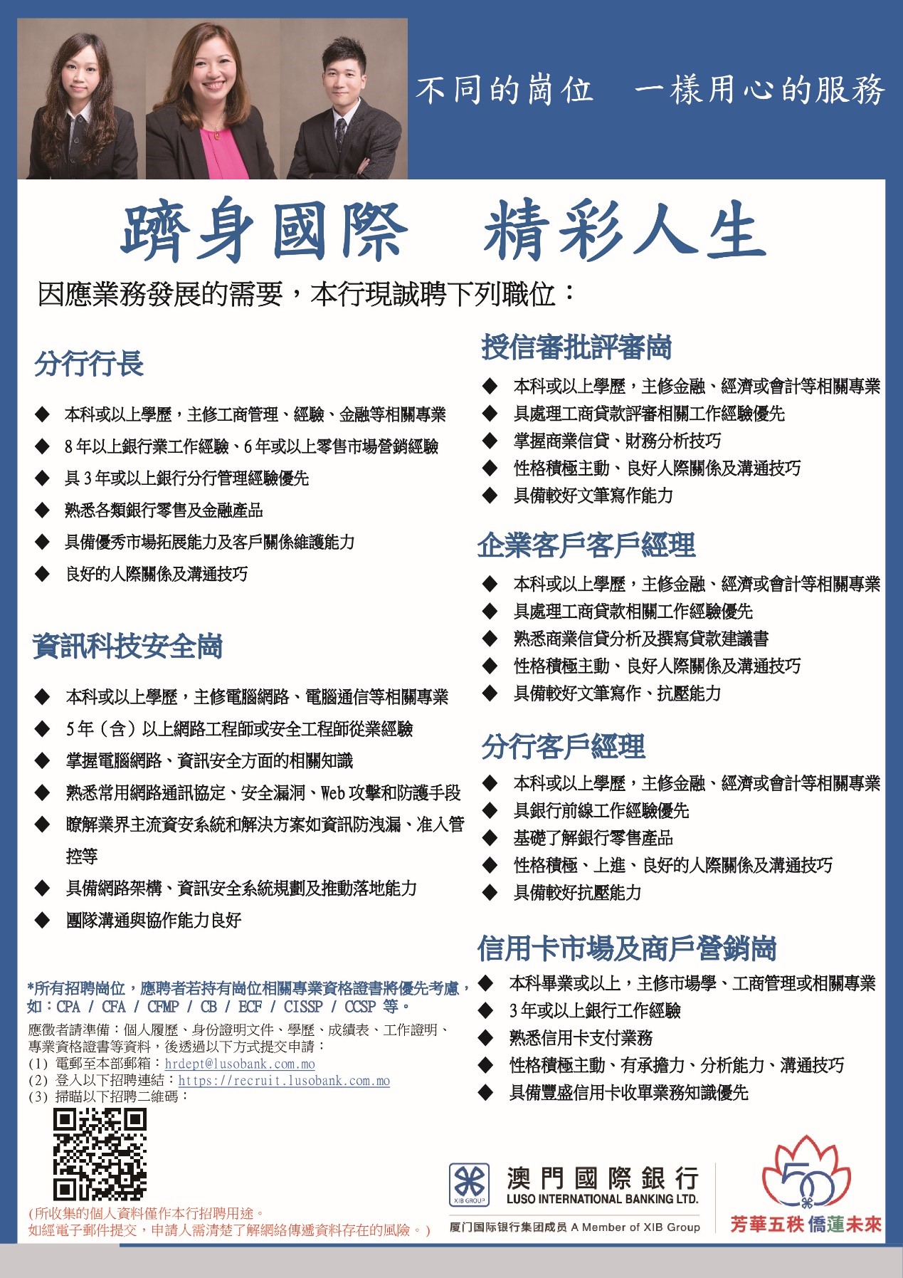 2. 電郵至hrdept@lusobank.com.mo (如經電子郵件遞交,申請人需清楚了解網絡傳遞資料存在的風險)