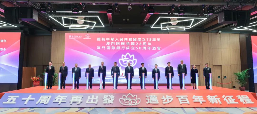 11月18日,澳門國際銀行在澳門旅遊塔會展中心四樓舉辦慶祝中華人民共和國成立75周年、澳門回歸祖國25周年、澳門國際銀行成立50周年酒會。全國政協何厚鏵副主席,澳門特別行政區行政長官代表、經濟財政司李偉農司長,中央人民政府駐澳門特別行政區聯絡辦公室呂玉印副主任,外交部駐澳門特別行政區特派員公署劉顯法特派員,澳門特別行政區立法會高開賢主席,中央人民政府駐澳門特別行政區聯絡辦公室經濟部劉德成部長,澳門金融管理局行政管理委員會陳守信主席,澳門中華總商會崔世昌會長,澳門中國企業協會傅建國會長,澳門銀行公會賈天兵主席,福建省投資開發集團林兵霞總會計師,廈門國際銀行王曉健董事長,澳門國際銀行黃來志董事長等出席主禮,來自政府部門及社會各界的400餘位嘉賓出席酒會。