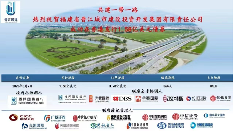 福建省晉江城市建設投資開發集團有限責任公司(以下簡稱「晉江城建」)上周四(10日)成功在澳門發行1.58億美元公募債券。該筆債券由澳門國際銀擔任聯席全球協調人、聯席簿記管理人、受托管理人以及支付代理人,吸引內地、香港、新加坡以及澳門本地投資者積極參與,最終發行較3.40%的初始價格指引收窄20個基點,最終定價3.20%。該筆債券是全國縣域經濟企業首單來澳門市場發行的債券,亦是澳門中央證券托管結算一人有限公司(MCSD)啟動以來全國非金融類企業首單赴澳門市場發行的債券。