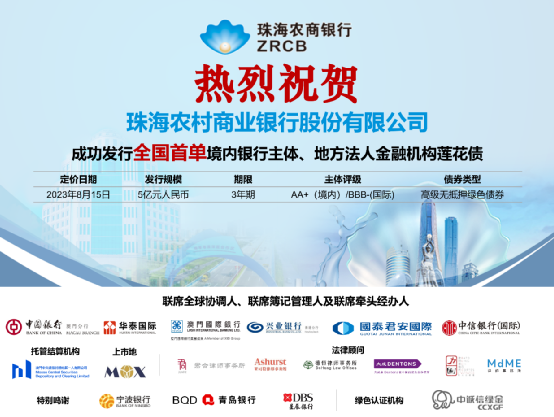 2023年8月15日,珠海農村商業銀行股份有限公司(以下簡稱“珠海農商銀行”)成功在澳門發行5億人民幣高級無抵押綠色債券,發行收益率3.50%,期限3年,本次債券在澳門中央證券託管系統登記托管結算、並在中華(澳門)金融資產交易股份有限公司(“MOX”)上市。