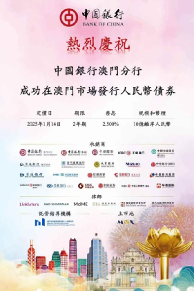 2025年1月14日,澳門國際銀行以聯席主承銷商及受託管理人身份助力本澳兩大金融機構在澳門成功發行首批“港澳互聯互通”債券,此次發行的債券在中華(澳門)金融資產交易股份有限公司掛牌上市,並通過澳門中央證券託管系統連接香港債務工具中央結算系統進行結算。這是2025年1月21日迅清結算有限公司(外匯基金全資附屬公司)負責營運的債務工具中央結算系統(“CMU”)與澳門中央證券託管結算一人有限公司(澳門金管局屬下全資附屬公司)負責營運的中央證券託管系統(“MCSD”)正式啟動直接聯網後首批在澳門發行並掛牌上市的債券。在直接聯網的安排下,香港投資者將可透過其在CMU的帳戶交收、結算及持有在澳門中央證券託管系統進行託管的債券。